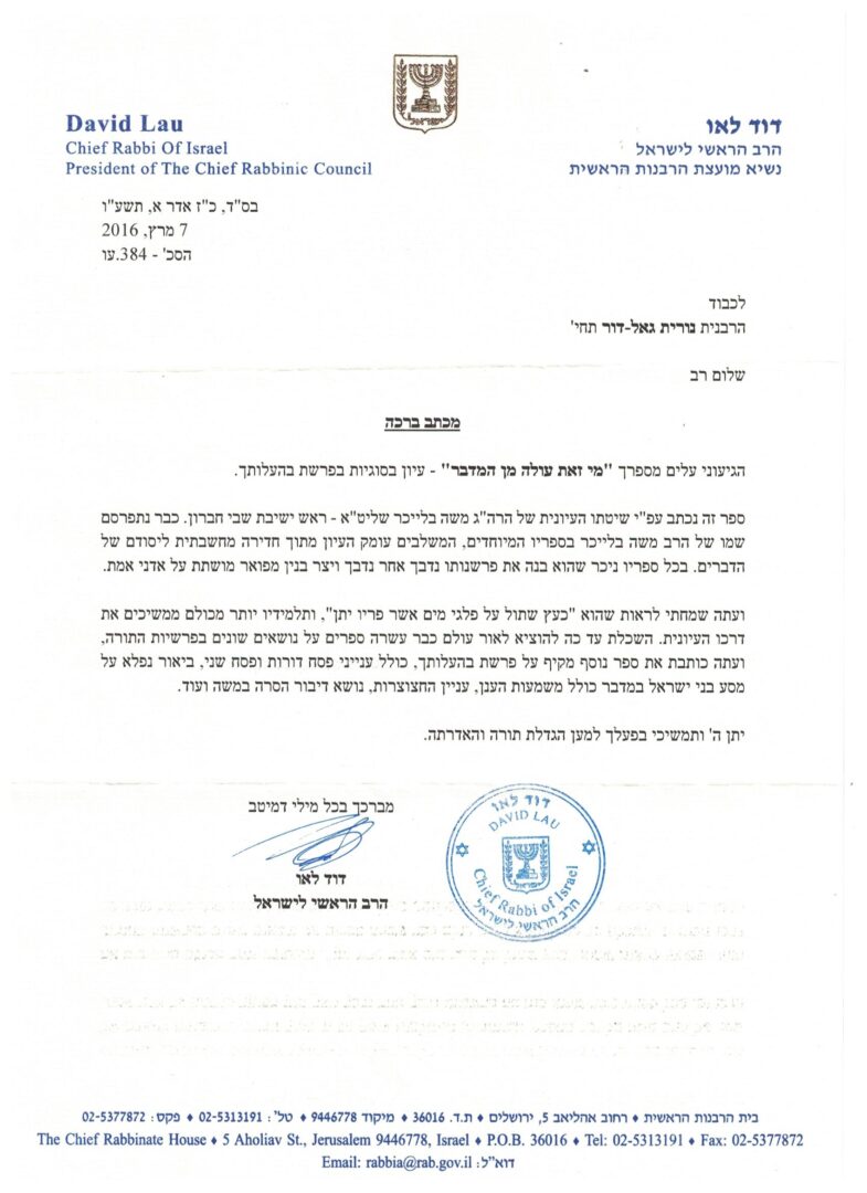 והנני לברך את המחברת, ברכת הדיוט, שתזכה לברך על המוגמר, וחפץ ד' בידה יצליח להוסיף עוד כהנה וכהנה, ויפוצו מעינותיה חוצה, לרומם את בני עמנו בתקופת גאולתנו, לאורך ימים ושנים טובות, עד "מלאה הארץ דעה את ד'" במהרה בימינו אמן.