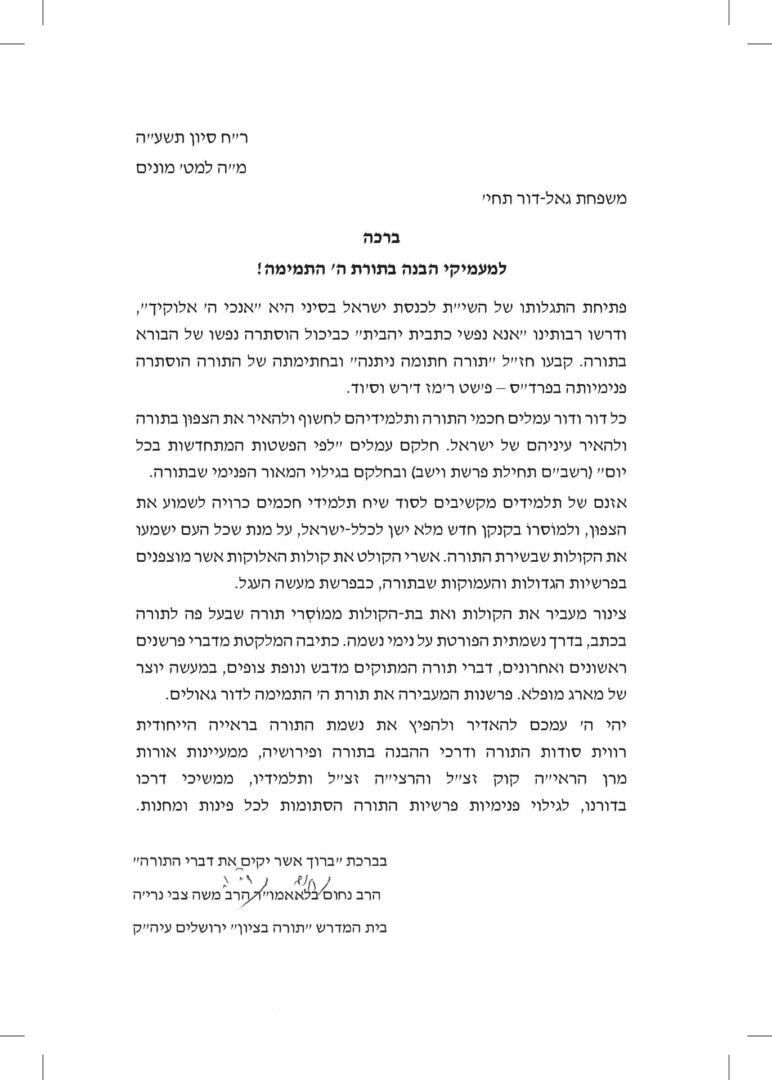 יהי רצון שיעסקו בתורה מתוך ספר זה והבנתו העמוקה. ויבורכו הכותבים שתהא תורתם מתפשטת בעולם, מתוך צאצאיהם כולם וכל המתברכים מתורתם.